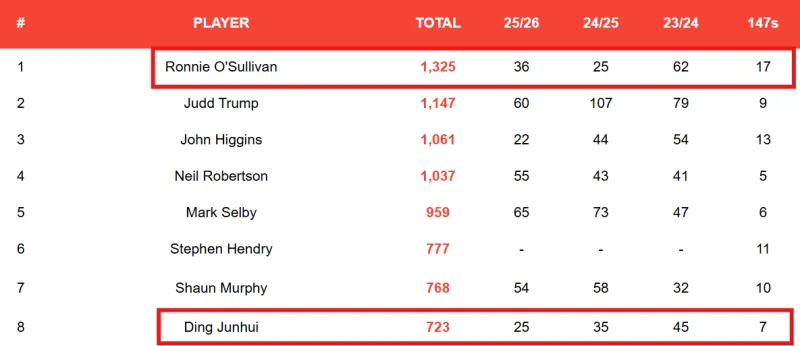• 职业生涯单杆破百最多次的选手:奥沙利文职业生涯破百总数已超1300杆,同时以17记147满分杆领跑历史;(丁俊晖以700+杆破百排名第8)