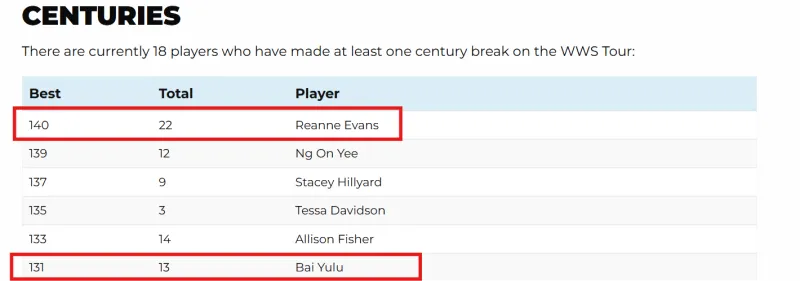 而女子斯诺克层面,据世界女子斯诺克官方统计,整个巡回赛历史上仅有18位选手打出过单杆破百;纪录保持者瑞安-埃文斯职业生涯破百总数也仅为22杆。即便近年进步显著的中国选手白雨露,单赛季破百最高也仅7杆。